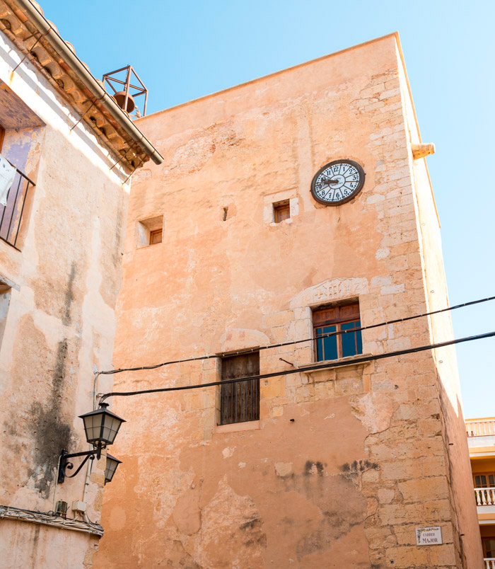 La torre tiene un reloj del que se conserva la maquinaria y que es el que marca la hora de Càlig. Durante la restauración actual se han hallado pinturas en las paredes que explican el paso del tiempo desde la época.