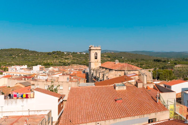 La vista desde la azotea de la torre de Càlig es impresionante. Desde allí podrás ver las azoteas de las casas, la cubierta de la iglesia y la ermita en medio de los árboles.