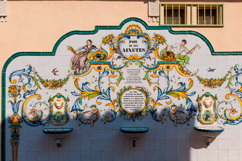 Un frontón de baldosas coloreadas y tres pilas de cerámica forman el Pou de les Aixetes, que data de 1928. El aspecto actual lo tiene gracias a la restauración que en el año 2006 se hizo de la fuente, adosada a un depósito de agua. Varias inscripciones en las baldosas cuentan la historia de Càlig desde su fundación. El depósito también tiene murales hechos con baldosas en las que se muestran varios lugares ilustres de Càlig.