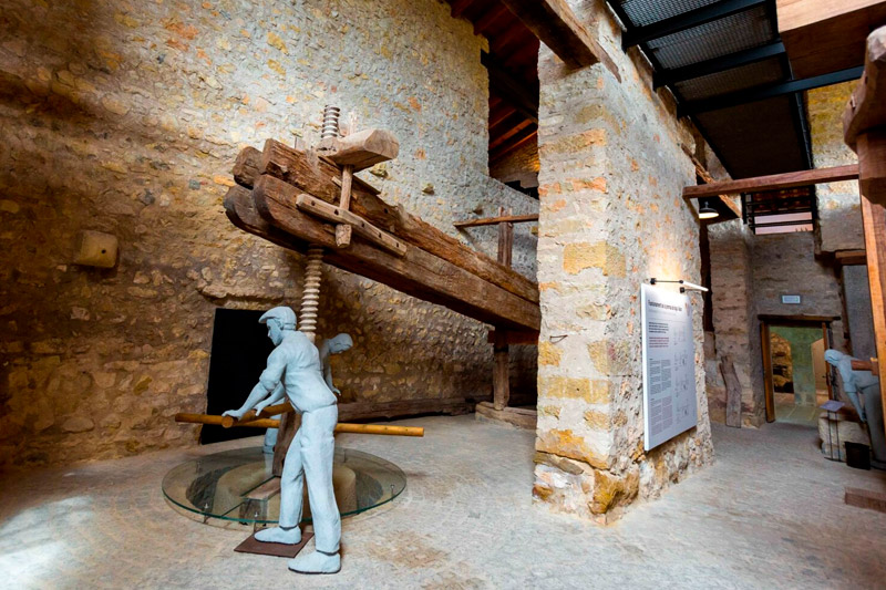 Dos enormes prensas hacían el proceso primordial de la transformación. La prensa de viga y quintal, manipulada por unas ocho personas, conseguía 120 litros de aceite en 24 horas. En el molino había dos, una de las cuales, de 1606, se ha conservado hasta el día de hoy. No es de extrañar que el aceite se llamara el oro líquido: no era tanto por su color, sino por lo caro que era conseguirlo.