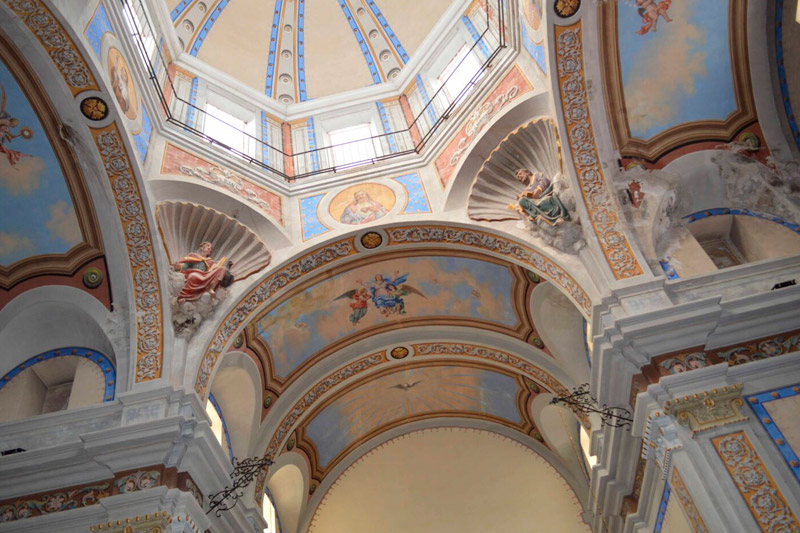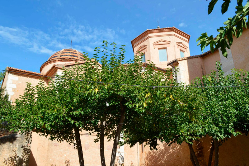 Un tambor de ocho lados corona el cuerpo de la iglesia, que se soporta gracias a la bóveda de cañón. Si miras desde la plaza Mayor podrás ver las aberturas laterales que dejan pasar la luz al interior. Igualmente podrás observar los detalles de la cabecera del campanario.