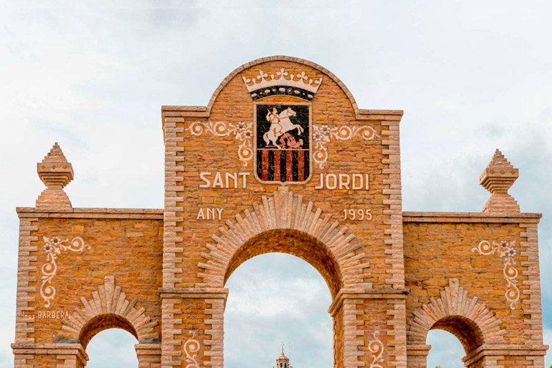 En la entrada de Sant Jordi encontrarás un arco del triunfo hecho con piedra. Incluye el escudo del pueblo y es símbolo de bienvenida. La obra la hicieron unos artistas locales, los hermanos Barberá, en 1995. Si miras a través puedes ver, enmarcado, el campanario de la iglesia de San Jaime.