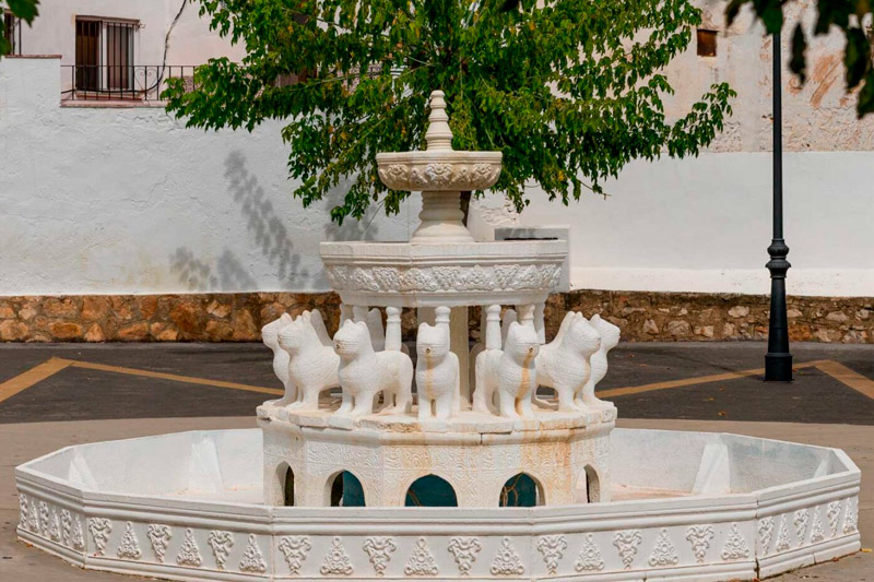 La plaza de España, uno de los lugares donde se concentran las fiestas, tiene una forma redondeada y, en el centro, una fuente redonda con una camada de pequeños leones de piedra. Cuéntalos. ¿Cuántos hay?