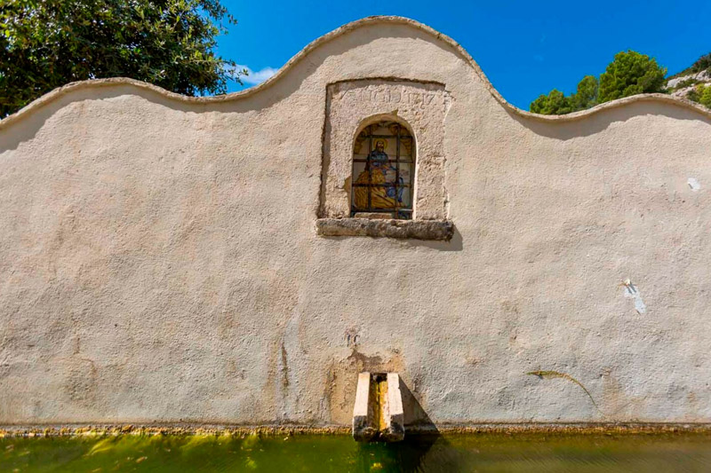 La fuente y el lavadero están en un rinconcito precioso en el que se oye el tintineo del agua que sale de la fuente. Tiene un frontón ondulado encabezado por una imagen pintada sobre baldosas de san Marcos de la Barcella.